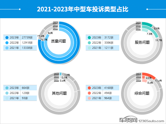 据车质网数据显示,在2023年中型车的投诉问题中,质量问题、其他问题和综合问题的投诉量均出现翻倍式增长。其中,综合问题较2022年涨幅超过7.4倍,占比提高8.7个百分点,投诉集中在部分自主品牌新能源车型。相比之下,服务问题的投诉量和占比均出现明显回落。