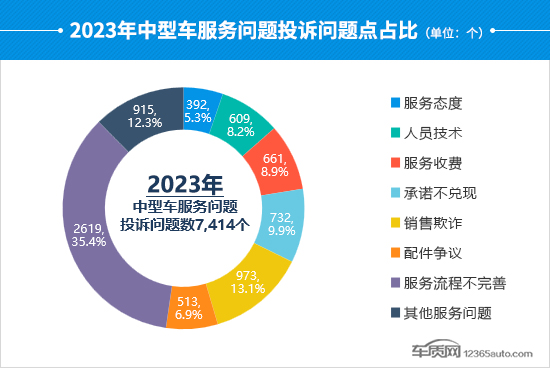作为国内领先的缺陷汽车产品信息收集平台,车质网2023年共受理消费者针对汽车产品质量及服务问题有效投诉168,725宗(含第三方平台和后装轮胎投诉共102宗)。其中,中型车累计投诉量为35,735宗,同比上涨112.2%。从投诉占比情况来看,占年度投诉总量的21.2%,与2022年相比提高8.7个百分点。2023年中型车投诉中,共涉及68个汽车品牌旗下的124个车系,同比增加了8个品牌和15个车系,整体投诉回复率为94.9%,相比2022年降低了1.4个百分点。其中,有38个品牌的投诉回复率达到了100%,同比增加6个品牌。