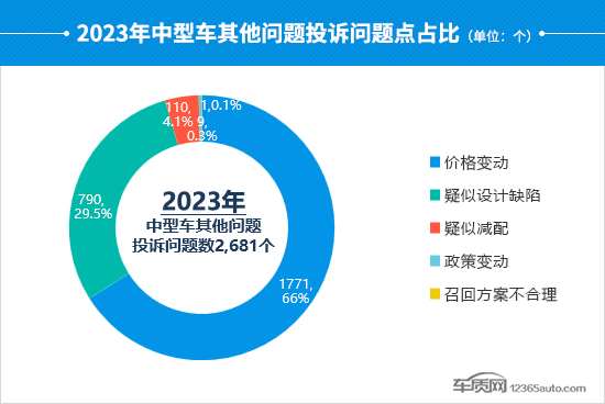 从2023年中型车其他问题投诉问题点情况来看,投诉问题点类型发生彻底改变,新增了“价格变动”和“政策变动”两类投诉问题点,其中前者一举成为占比最高的投诉问题点,超过总量的六成,投诉主要来自于部分热销自主品牌新能源车型。相比之下,“疑似减配”的投诉问题点虽较2022年有所增长,但占比下降了49.4个百分点,已降至个位数。