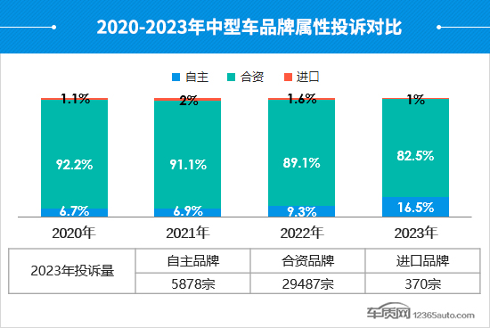 据车质网投诉数据显示,2023年中型车的投诉主体依旧是合资品牌,投诉量较2022年上涨96.5%,但投诉占比降至近四年来的最低点。相比之下,自主品牌的投诉量和占比均较2022年有所提升,其中投诉量同比涨幅约2.8倍,占比更是首次突破至两位数。