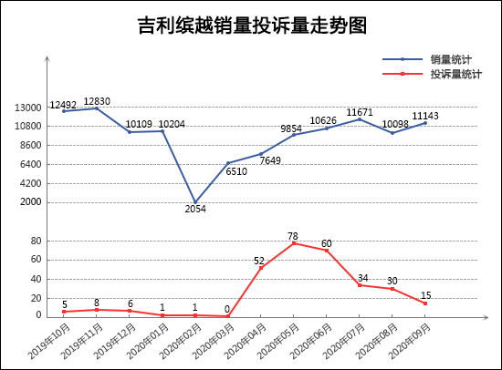 2020年对于吉利缤越而言充满了挑战,尽管年初因疫情影响导致销量跌至谷底,但缤越随即以一波“五连涨”迅速走出低谷。9月份,缤越达成了连续四个月销量破万的成绩,市场表现已逐步回归常态。从其近一年来的销量投诉量走势来看,销量呈现出“大V”走势,自今年3月份开始销量便开始一路走高。反观其月投诉量表现,虽然在年中遭遇了投诉异常增多的情况,但通过厂家的妥善解决,月投诉量已实现连续六个月下降,9月份的投诉量降至近半年来的最低点。今年4月,缤越推出了PRO车型,在外观和配置方面进行了升级,有效刺激了缤越的市场表现,这一点从其连续上涨的月销量上便可见一斑。综合来看,在销量稳步走高,质量口碑逐步向好的双重利好推动下,缤越未来的市场表现将进一步得到提升,为吉利品牌顺利实现年度销量目标提供关键助力。