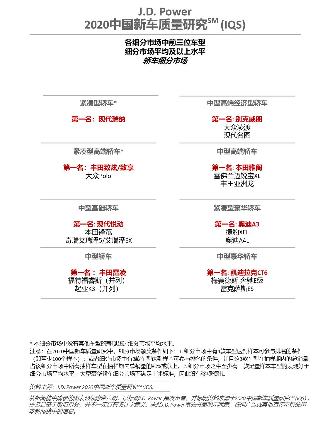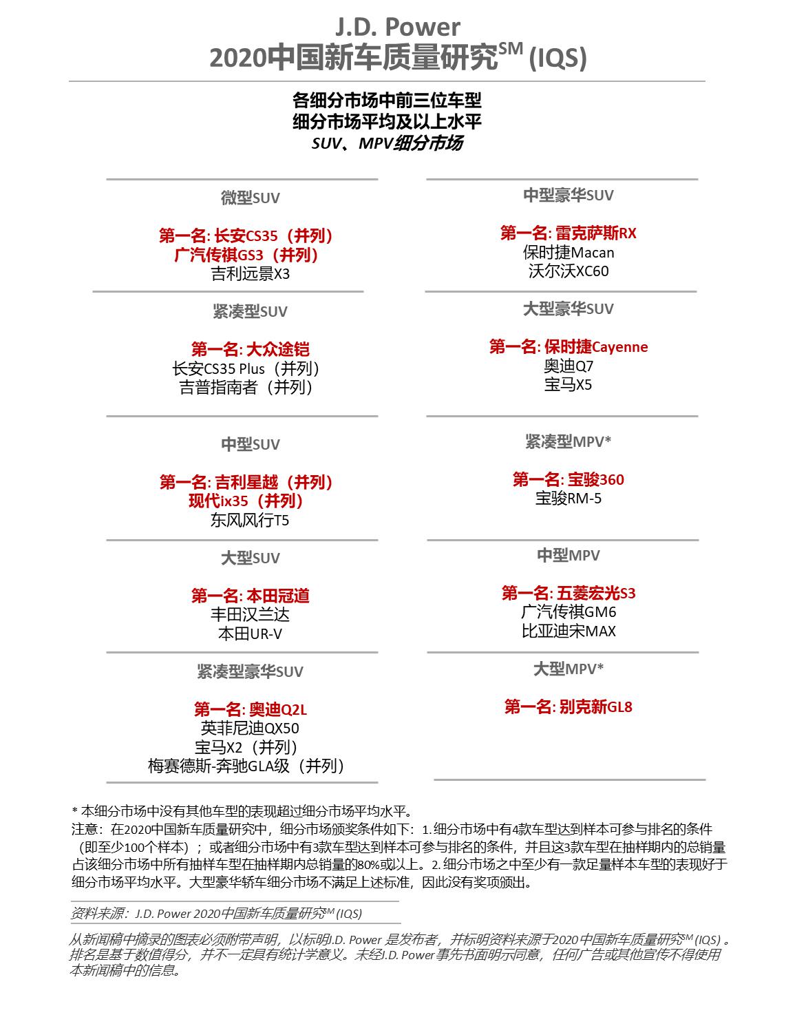 车型层面,共有14个品牌的20款车型在2020年中国新车质量研究中摘得18个细分市场奖项。