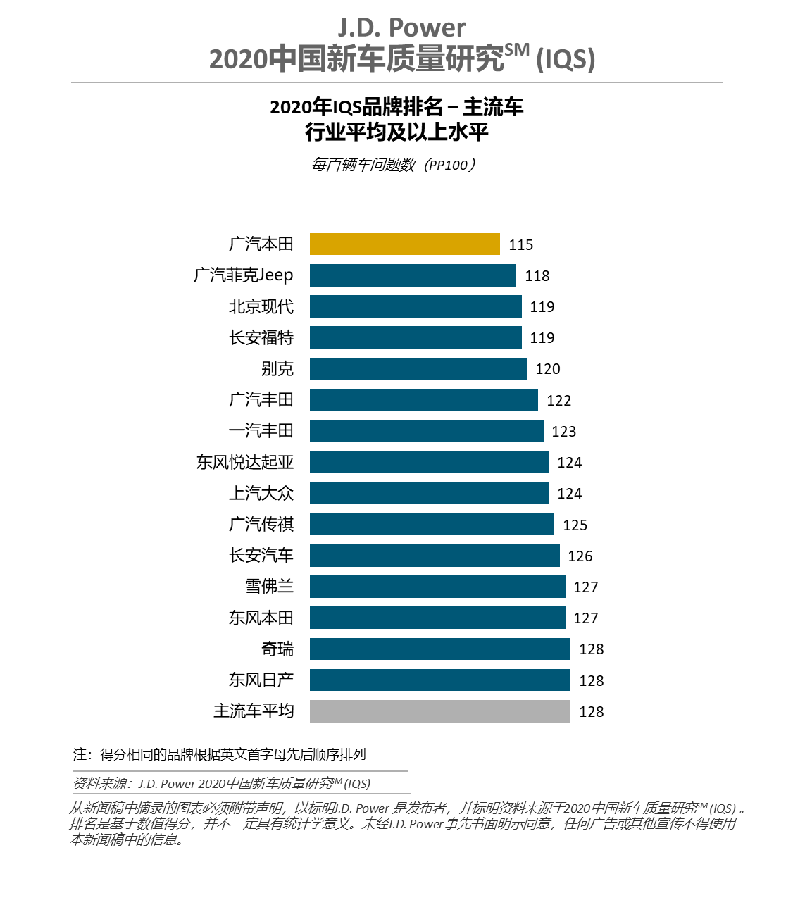 广汽本田(115个PP100)摘得主流车细分市场新车质量第一。广汽菲克Jeep(118个PP100)排名第二,北京现代与长安福特(119个PP100)并列第三。广汽传祺(125个PP100)连续第八年获中国自主品牌第一。
