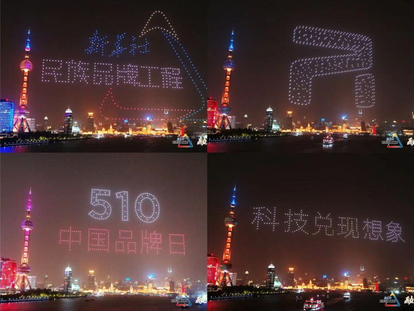 5月7日晚的黄浦江两岸,生机勃勃的现代化摩天大楼与历经沧桑的万国建筑群交相辉映,由510架无人机组成的飞行编队,逐渐点亮,冉冉升起,如同璀璨星光,以绚烂的造型在空中勾勒出茅台、光明、R汽车等多个知名中国品牌图案,正式揭开“2021中国品牌日”的序幕。