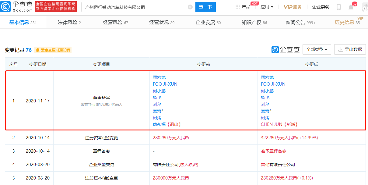 企查查App显示,11月19日,广州橙行智动汽车科技有限公司(小鹏汽车母公司,以下简称广州橙行智动)发生工商变更,董事俞永福退出,新增董事CHEN JUN。资料显示,俞永福为阿里巴巴合伙人,阿里巴巴文娱集团董事长兼CEO。