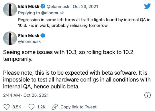 马斯克在Twitter上表示,10.3版本一直出现问题,所以现在暂时回滚到10.2版本。注意,这就是Beta测试版本预期会出现的问题,在内部质量验证时测试到所有的硬件配置和使用场景是不可能的,所以这也是为什么会有公测的意义。