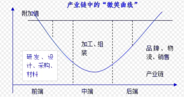 就像是一条微笑曲线一样,美国企业只管前端和后端,将研发、设计、销售牢牢握在手里,如智能化技术、芯片设计等等,而至于低技术的制造,则可以交给墨西哥、东南亚等国家完成。