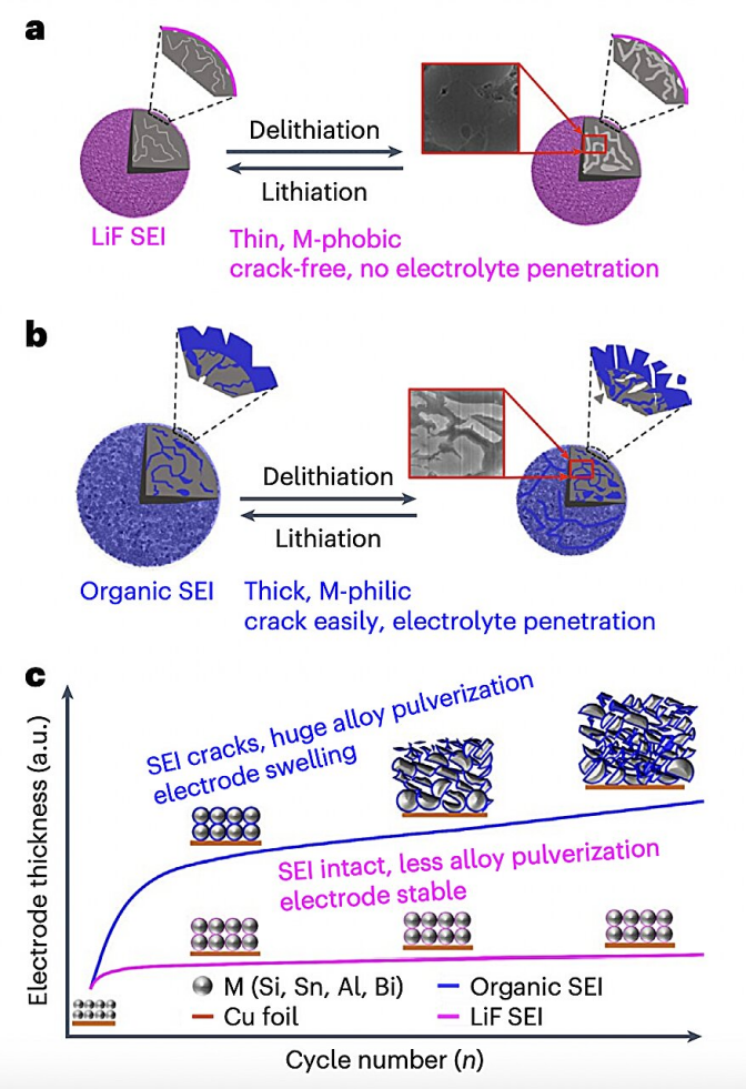 合金阳极基于可以与锂反应的金属合金,例如硅(Si)、锡(Sn)或铝(Al)。与石墨阳极相比,这些合金基阳极具有明显的优势,比如成本更低,以及有望提高电池容量。尽管如此,事实证明,微尺寸合金阳极的可靠性不如石墨阳极。其中一个原因是它们经常会导致容量快速衰减和库仑效率低下,尤其是与碳酸盐基电解质结合时。