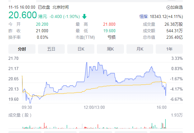 9月29日,零跑汽车正式在港交所上市,募资60.57亿港元,IPO市值548.64亿港元,成为继“蔚小理”之后,第四家成功上市的造车新势力。但上市即破发,当日盘中股价一度较发行价每股48港元下跌近40%。11月15日,股价报收20.6港元,跌幅1.9%。